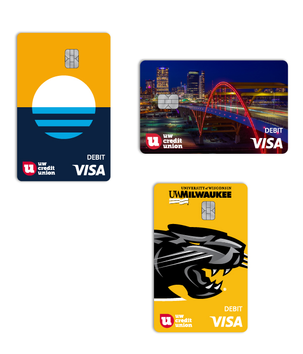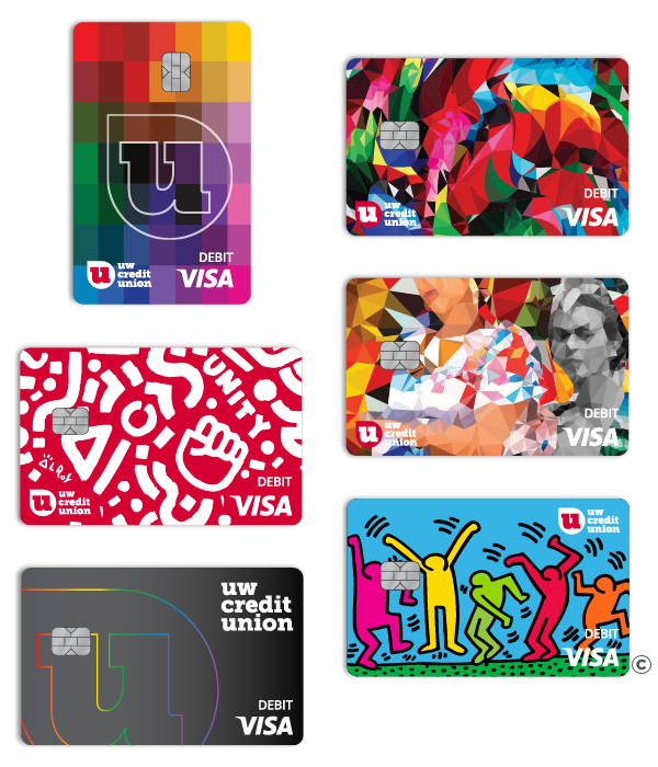 Choose from a range of exclusive debit card designs from UW Credit Union and show off your style. All our Visa® debit cards are secure, easy to use, and free with your checking account.
